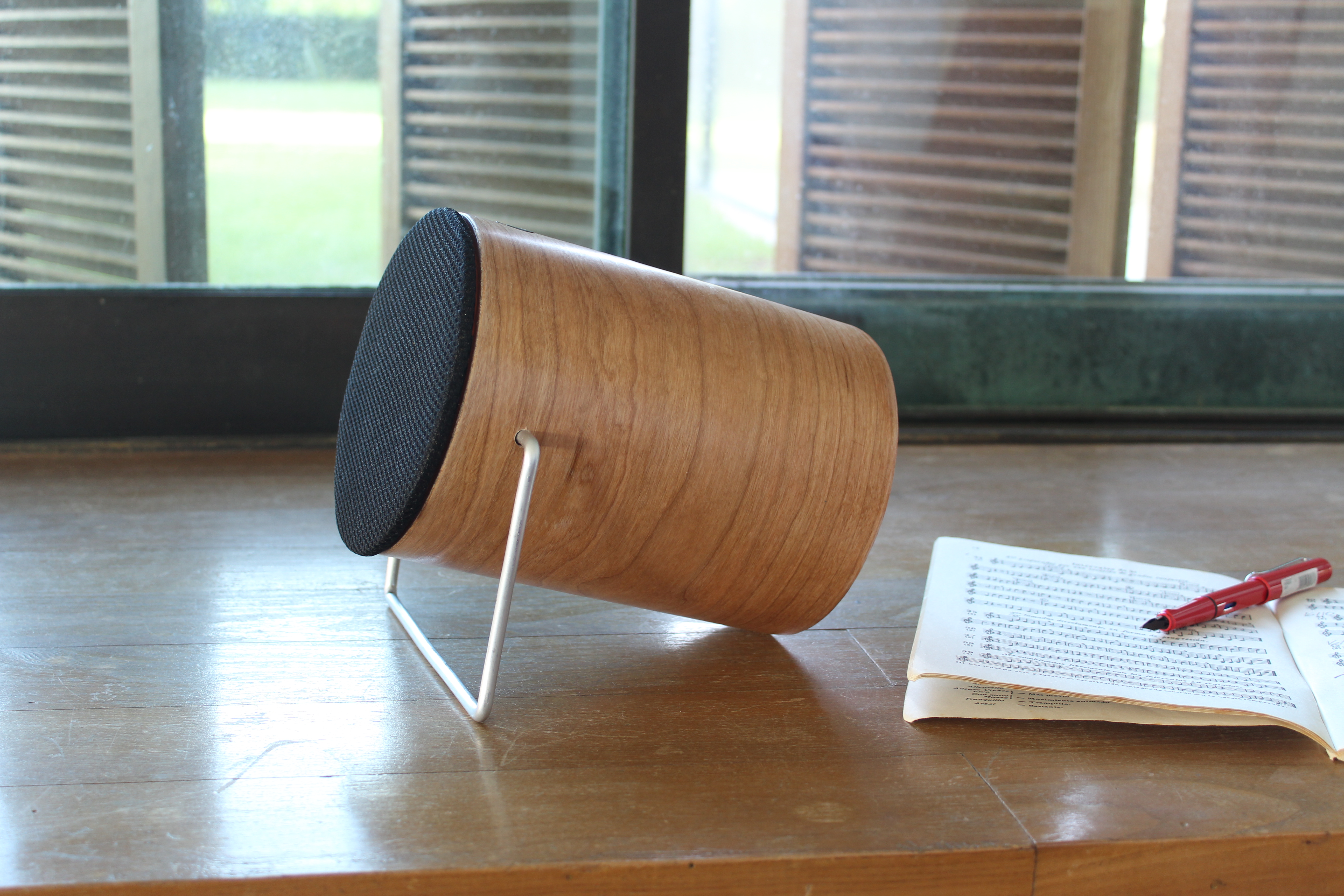 This cylinder is made of wood, as this material provides greater acoustics to the device and more warmth in the sound. The wood chosen is cherry, as it is considered one of the noblest. At the top we find the sound outlet: a black fabric mesh stretched over a DM wood ring. Magnets are added to this structure, which allow the mesh to be put on or removed. In addition, an aluminum handle allows the device to be portable, as well as providing sustainability and support when placed horizontally. Finally, the on/off button is located on the front.